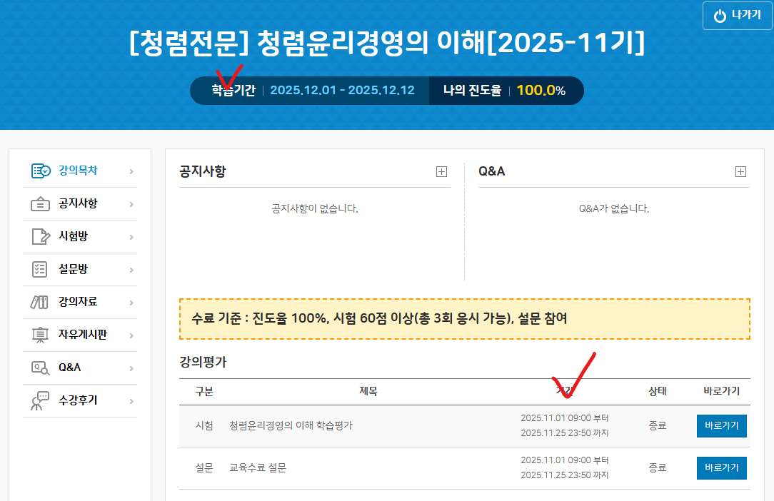 학습 기간은 25.12.01~25.12.12까지인데 강의평가 기간은 25.11.01~25.11.25로 되어있어 시험과 설문 응시가 불가합니다 확인 부탁 드리겠습니다